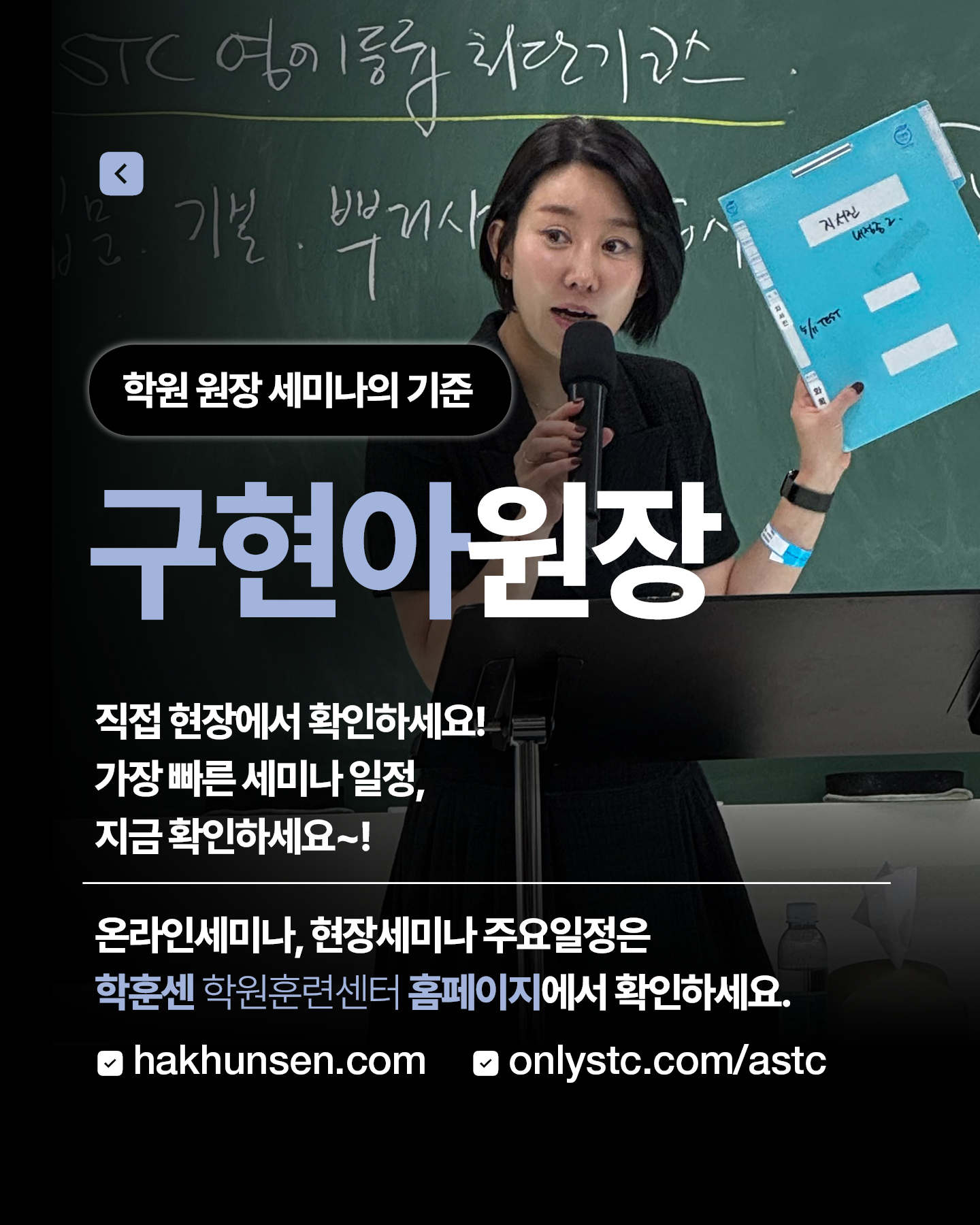 학원을 운영하시는 원장님이라면, 구현아원장의 현장세미나는 어떤 주제를 다루건 한번은 반드시 참석해보시길 바랍니다.