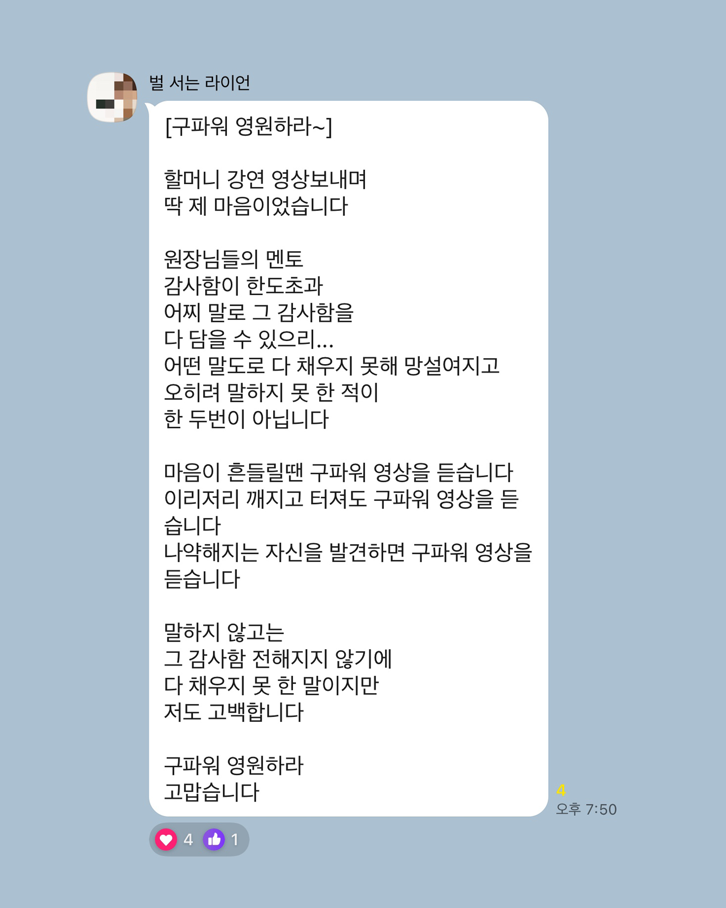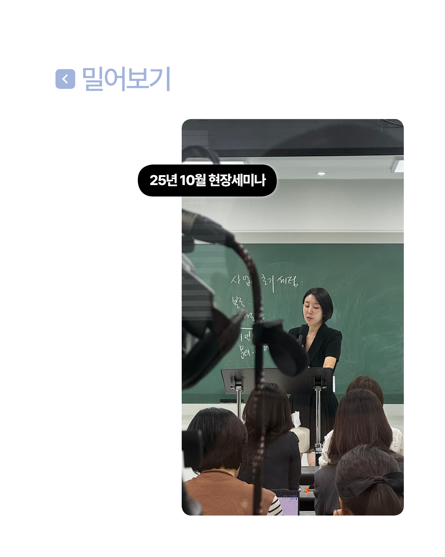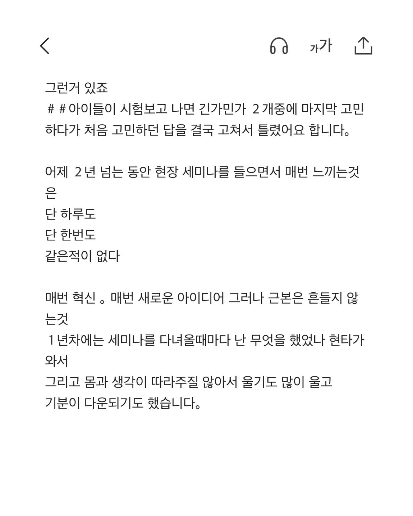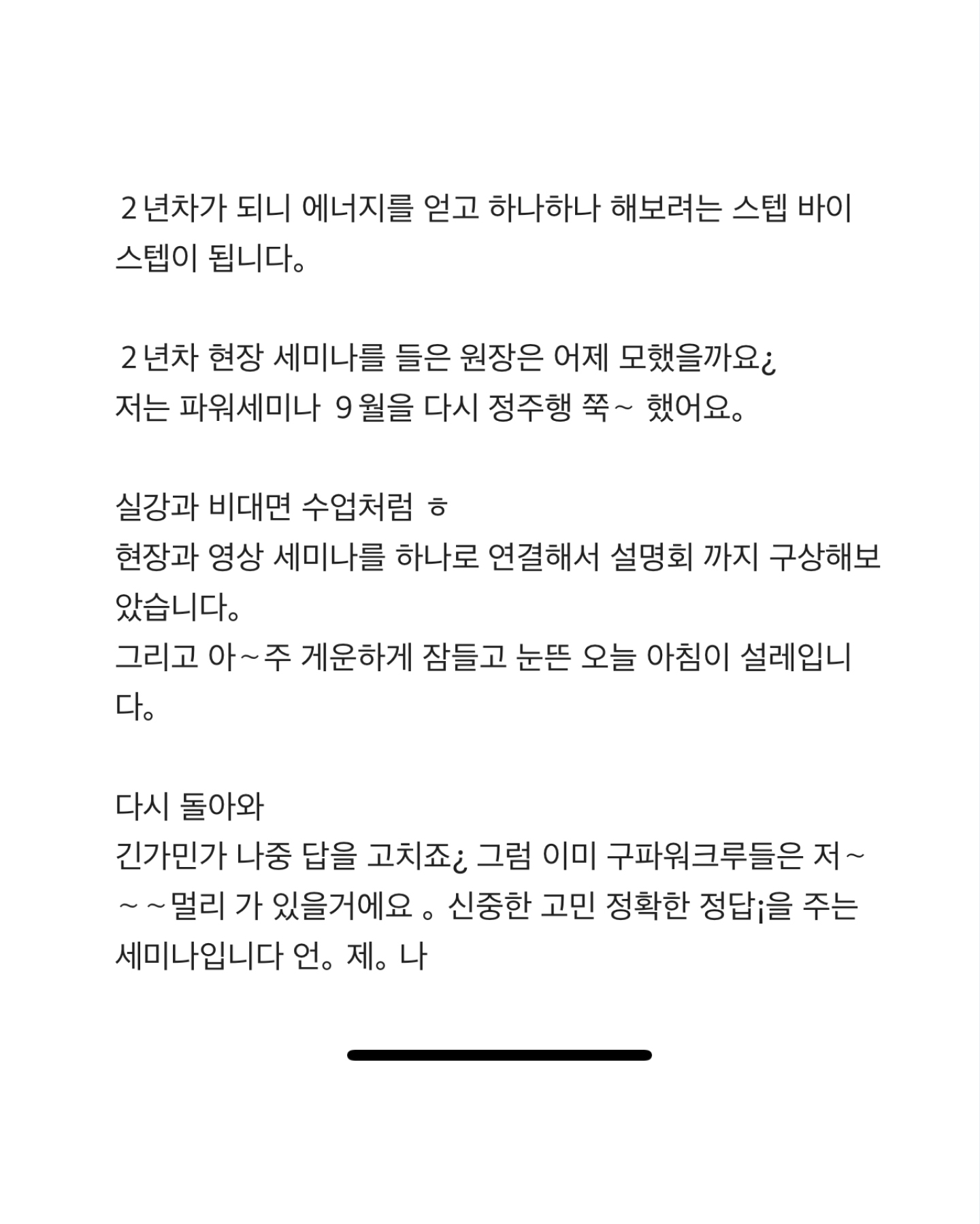 감동의 포인트가 한두개가 아니지만, 하나만 더 얘기해보자면 구파워님의 에너지가 잘 전달되는 비밀을 이제 조금 알거 같습니다 학원현장에 적용하면서 더더욱 감동합니다. 언제나 사고의 확장과 자극을 주셔서 감사합니다. 8월세미나 벌써부터 설렙니다.