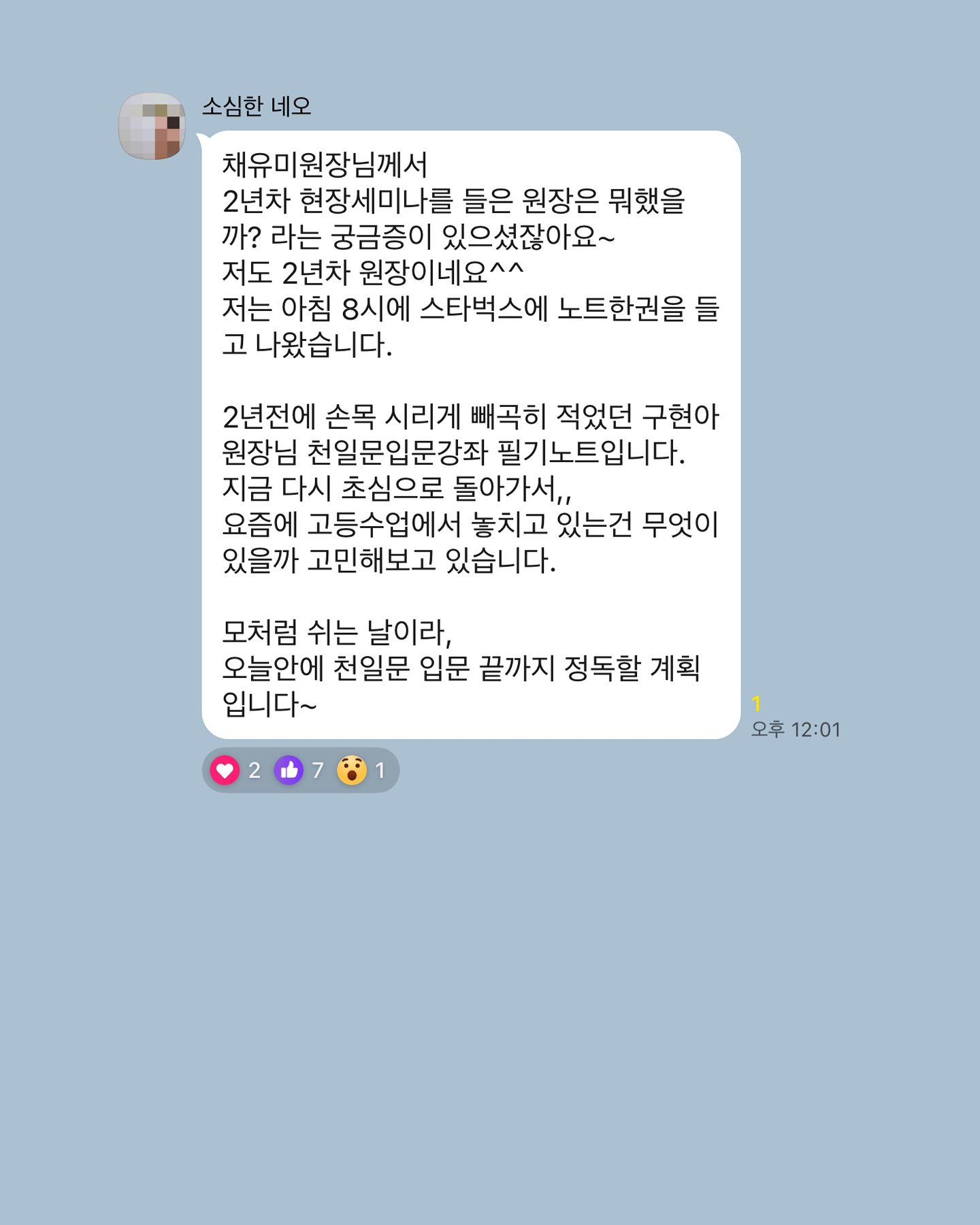 안녕하세요~파워 세미나 시즌1수강중입니다☺️ 아직 다 듣지는 못하였지만… 우선 원장님께서 너무 많은 것을 알려주십니다 제 그릇으로는 도저히 다 담을 수가 없어 안타까울 지경입니다😅 강의 자료 프린트하고 필기하면서 열심히 듣고 있는데 내용이 너무 많아 손목이 뻐근합니다😂 저도 나름 열심히 해왔다고 생각했는데, 원장님 강의 보면서 반성 많이 합니다 원장님 학생들이 많이 부럽기도 하구요 우리 아이들에게 나도 저런 원장님이 되어 주면 좋겠다는 생각을 하게 됩니다 일이 제 생각대로 진행되지 않아 나름 답답하고 마음이 고된 시간을 보내고 있었는데, 요즘 강의들으면서 점점 실마리를 찾아가는것 같아 늘 감사한 마음 가지고 있습니다🙏 그리고 이 강의들을 통해 저희 학원이 큰 전환점을 맞이할수도 있겠다는 생각을 조심스레 해봅니다 3월 파워 세미나도 신청했는데 벌써부터 기대가 됩니다~👍 저만 그런건 아니겠지요😆