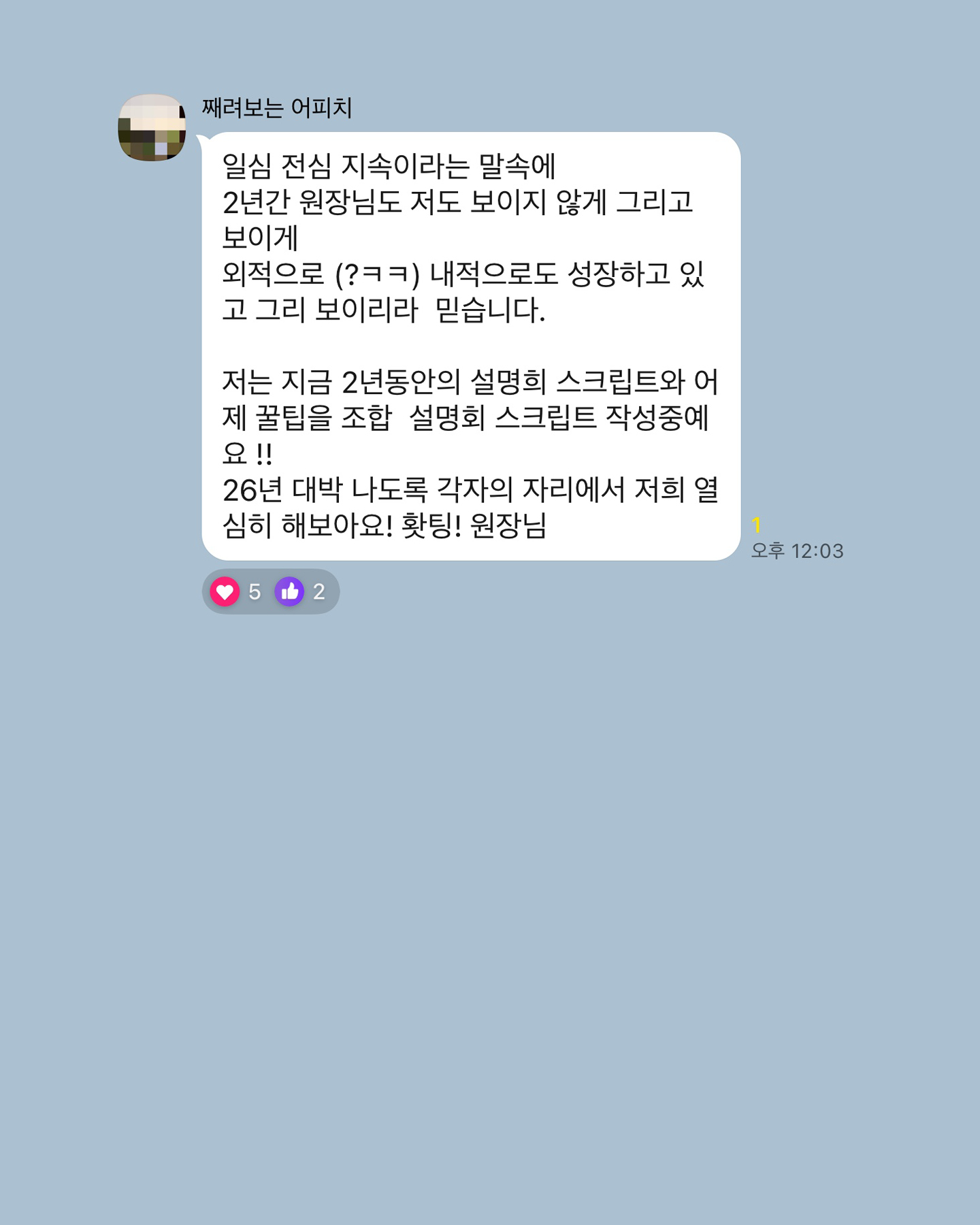 원장님의 강의는 항상 1000% 좋습니다! 제가 학생때 원장님의 강의를 들었다면, 이미 지금 얼마나 대단한 삶을 살고 있을까 하는 생각을 종종합니다. 앞으로도 일심전심 지속하겠습니다!